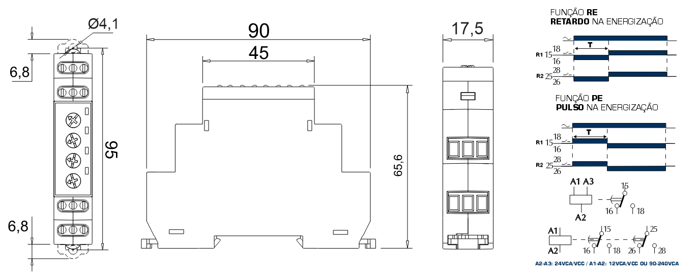 - Função Retardo (RE) e Pulso (PE) na energização.