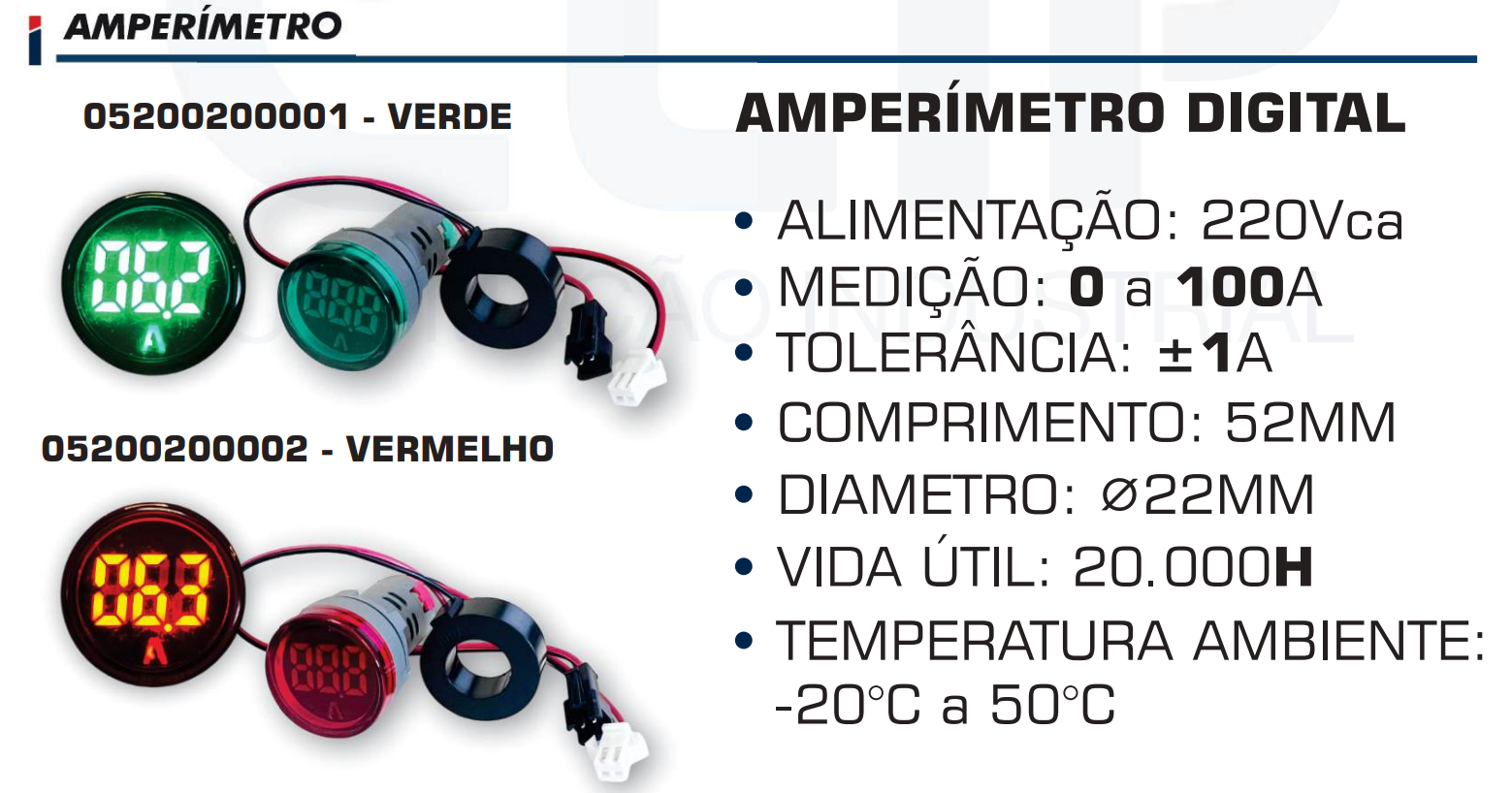 05200200002 - AMPERIMETRO DIGITAL 22MM 100A VERMELHO